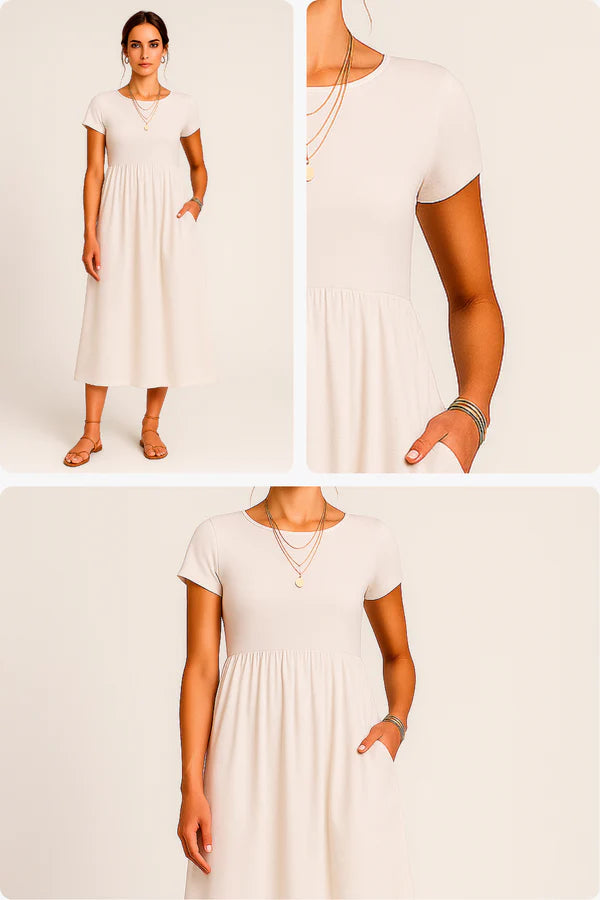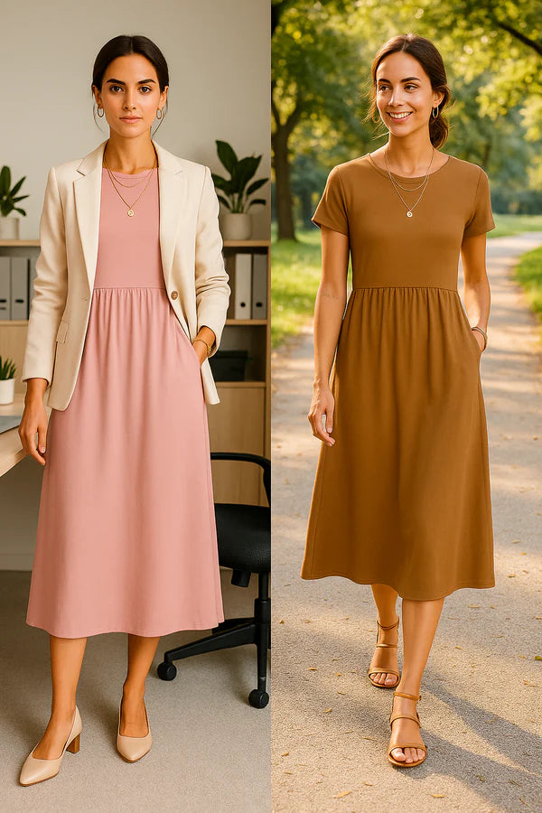 The Alice Midi Dress blends comfort and style with a fluid cut – perfect for practical, everyday sophistication.