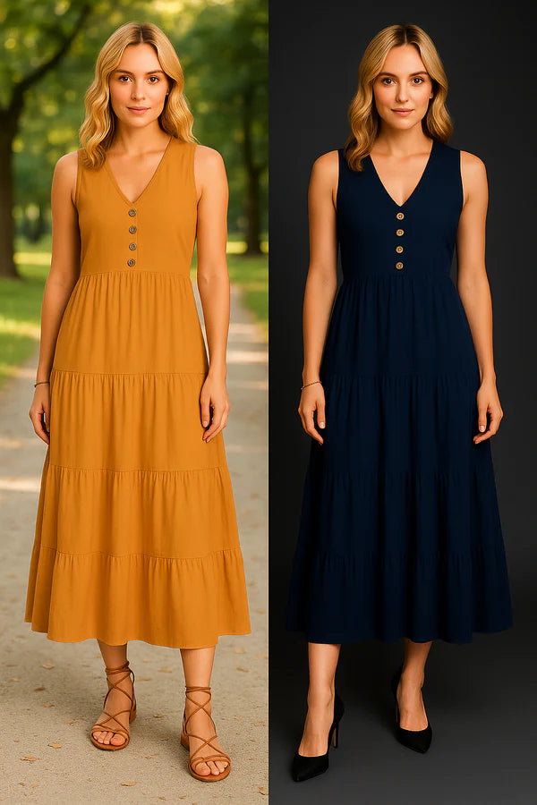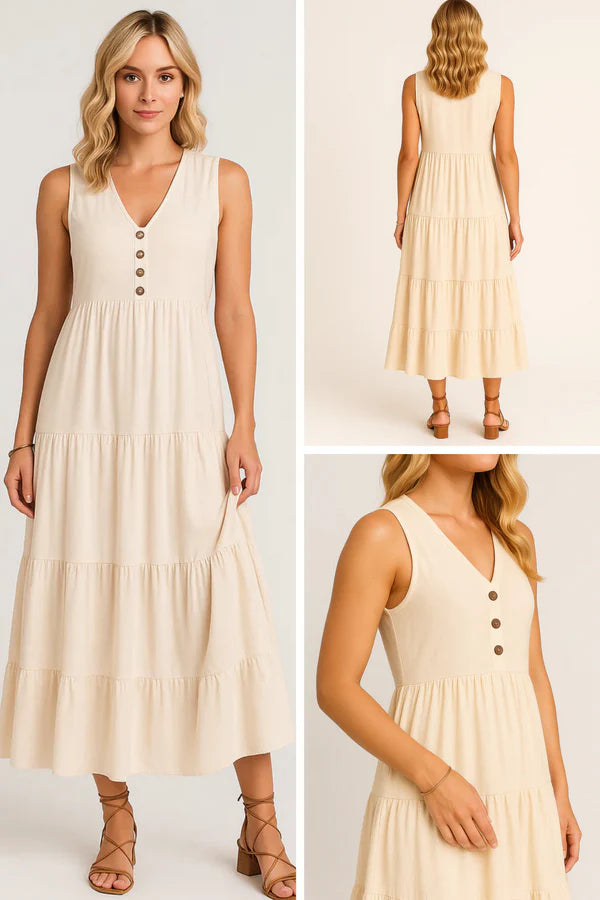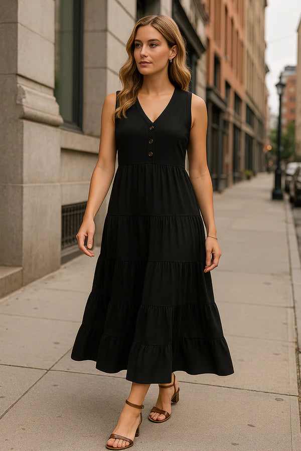 Its sleeveless long cut with three tiers creates a flowing, refined look.