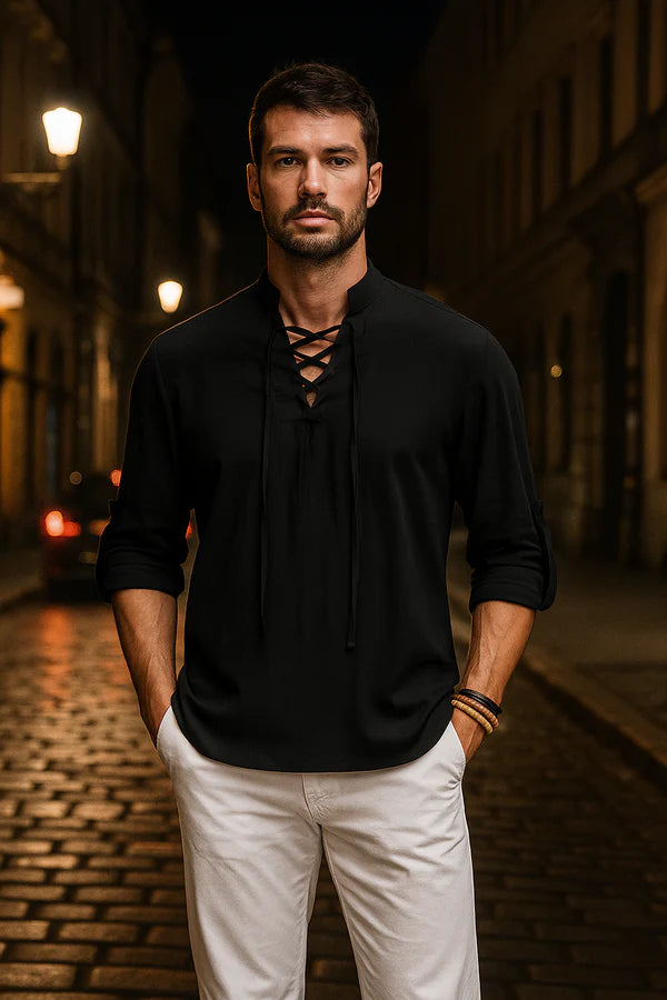 The Monarch Shirt, featuring a mandarin collar and lace-up fastening, brings a sophisticated, modern touch that truly stands out.