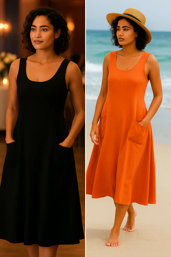 The Isadora Midi Dress combines practicality and style with its flowing cut, flattering the silhouette on any occasion.