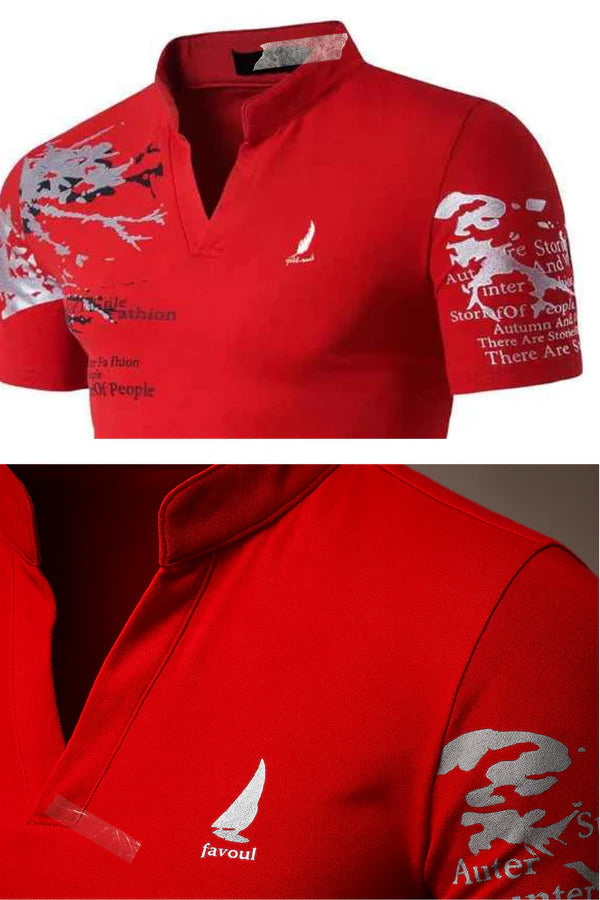 Inspired by golf polos, this T-shirt features a stand-up collar with stripe detail, offering a modern and distinctive look for summer days.
