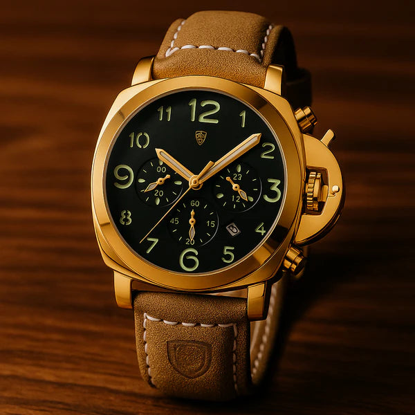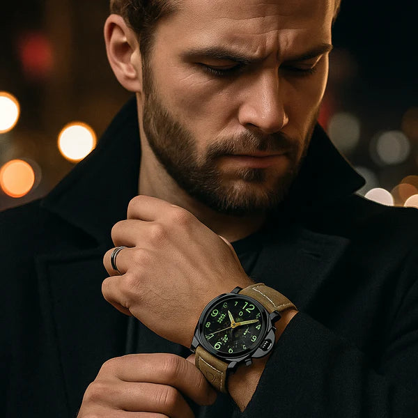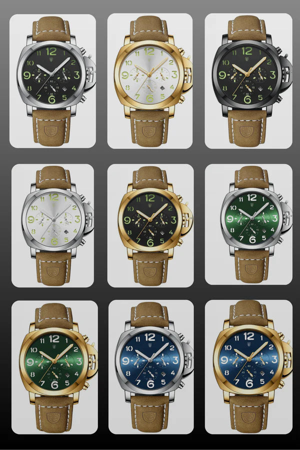 Crafted in stainless steel with a premium leather strap, it features scratch-resistant glass and luminous hands for durability and legibility, even in low light.