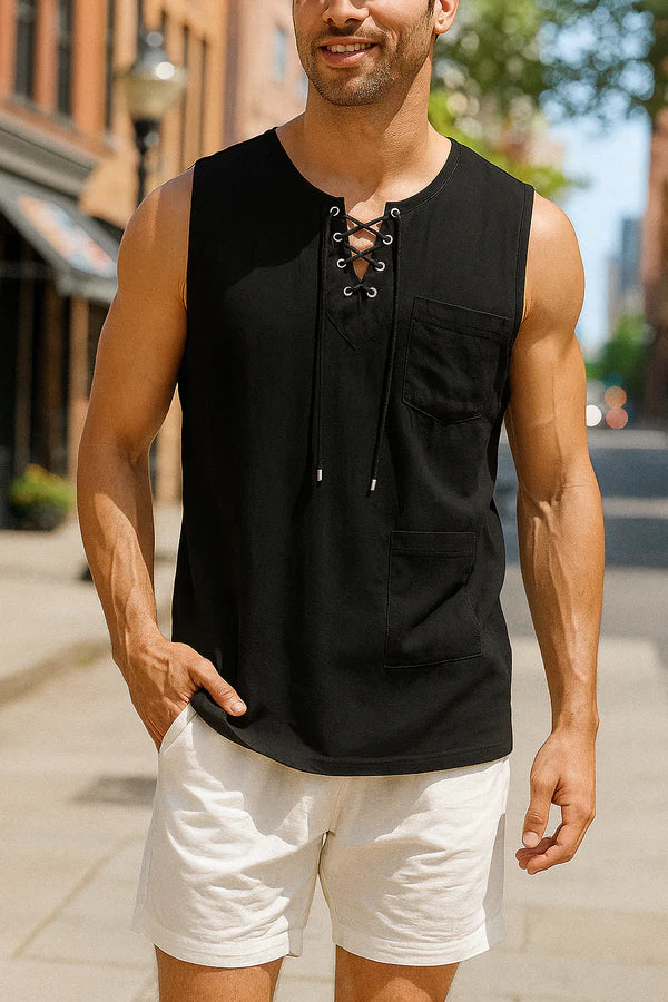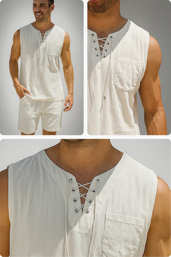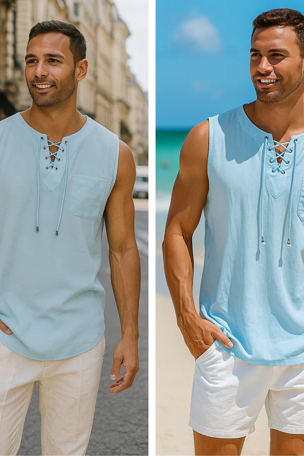 Monarch Sleeveless Linen & Cotton Shirt – Retro Style with Lace-up Detail