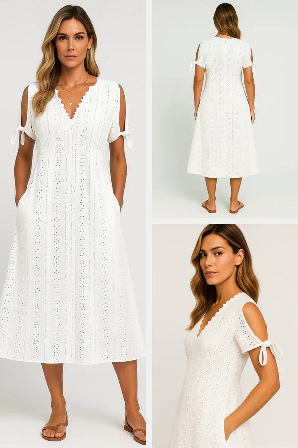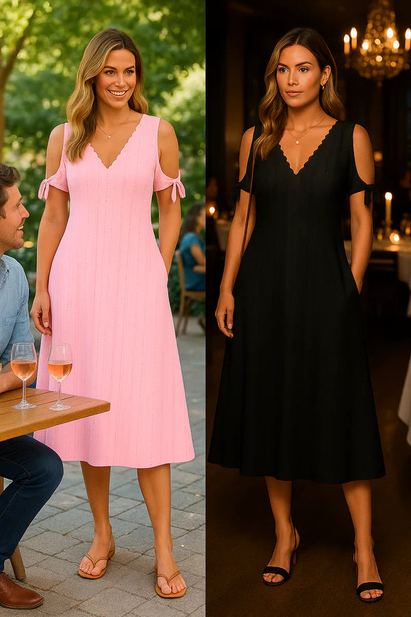 The Zoe Midi Dress pairs a lace-trim V neckline with a fluid cut that flatters every silhouette.
