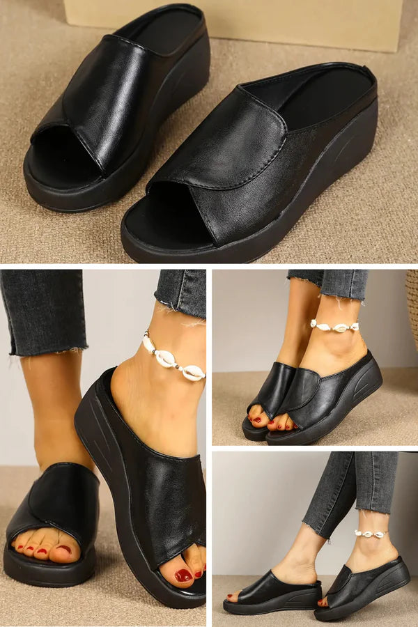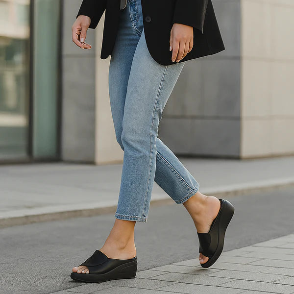 The NoirLift Mule has been designed to provide practicality and well-being. Its anatomical design with wedge heel ensures balance and walking support, without compromising elegance.
